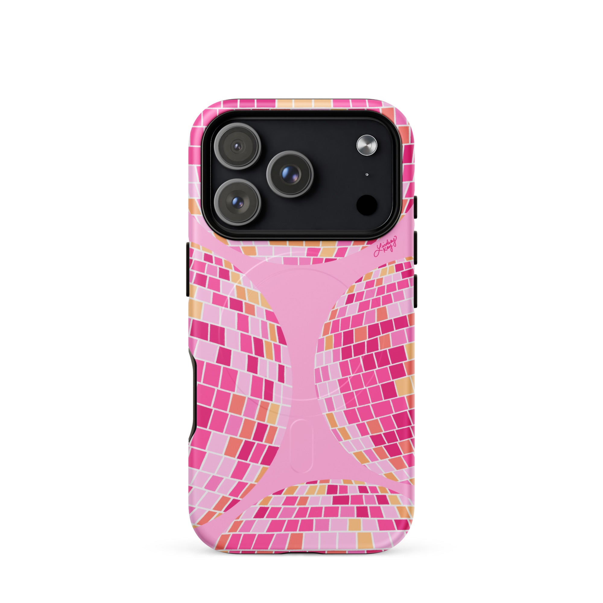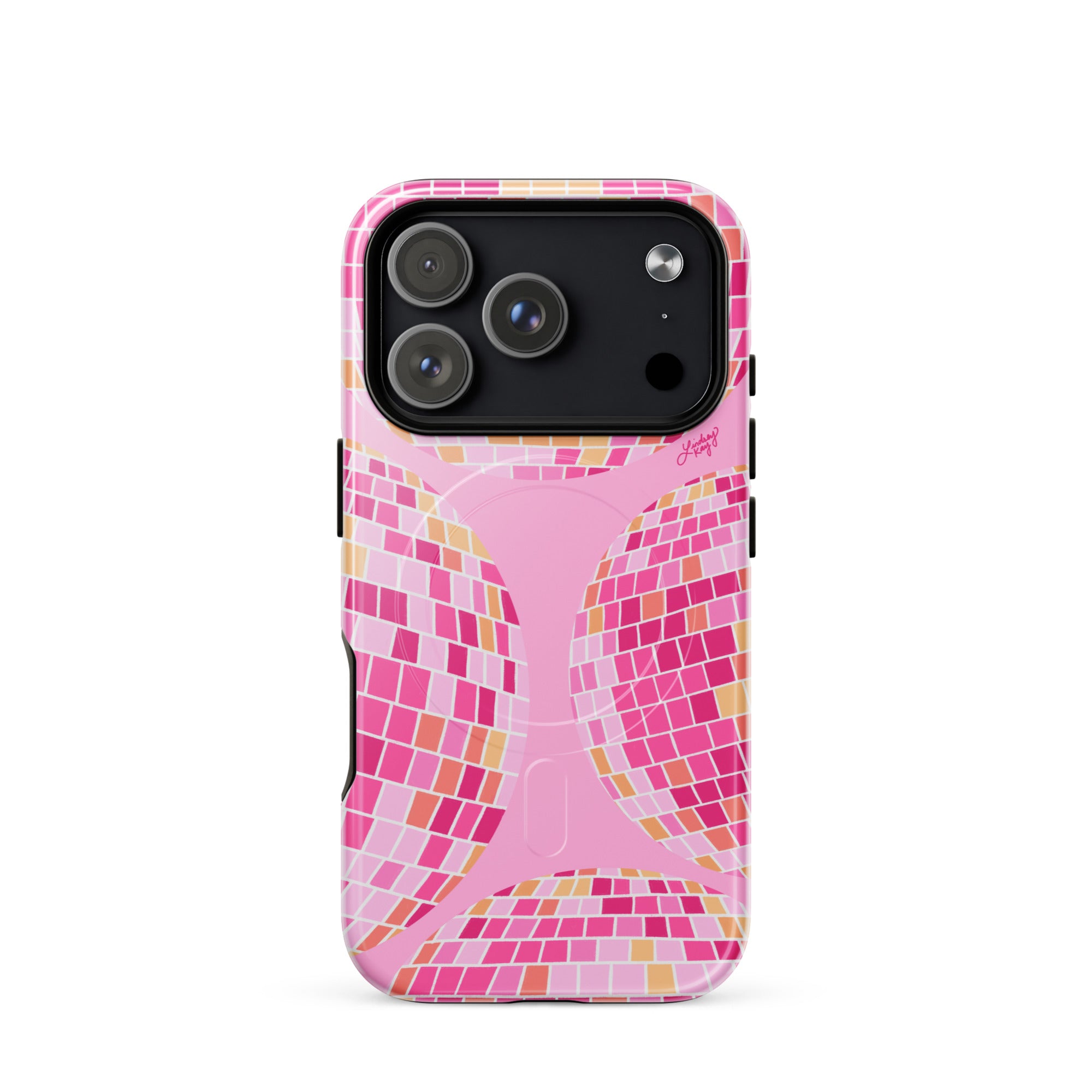 Protect your phone with this tough, dual-layer pink and yellow disco balls case. Its impact-resistant shell and shock-absorbing liner keep your device safe, while built-in MagSafe® magnets ensure secure attachment and faster wireless charging.