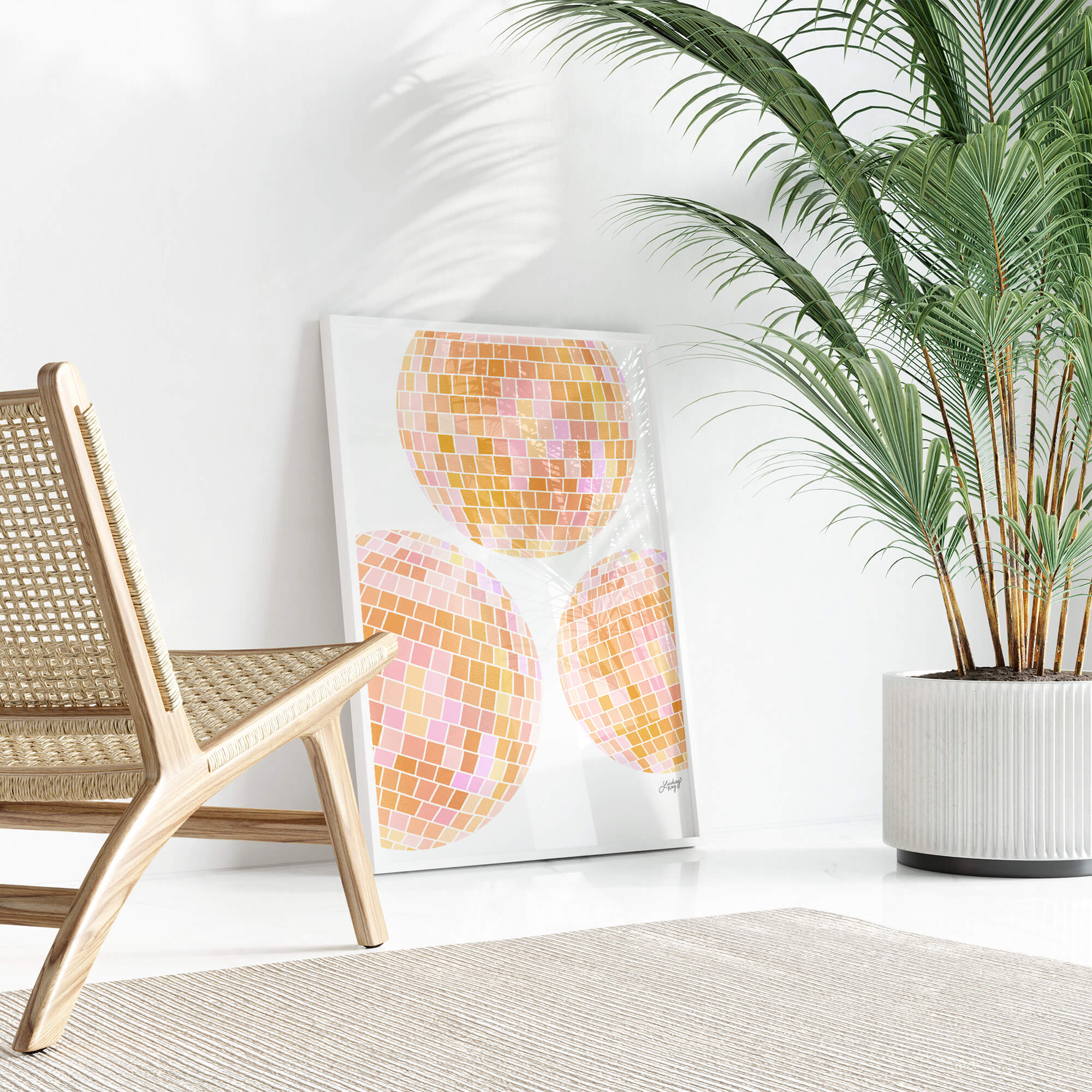 Une illustration dessinée à la main de trois boules disco jaunes. D'autres options de couleurs sont disponibles dans la boutique !