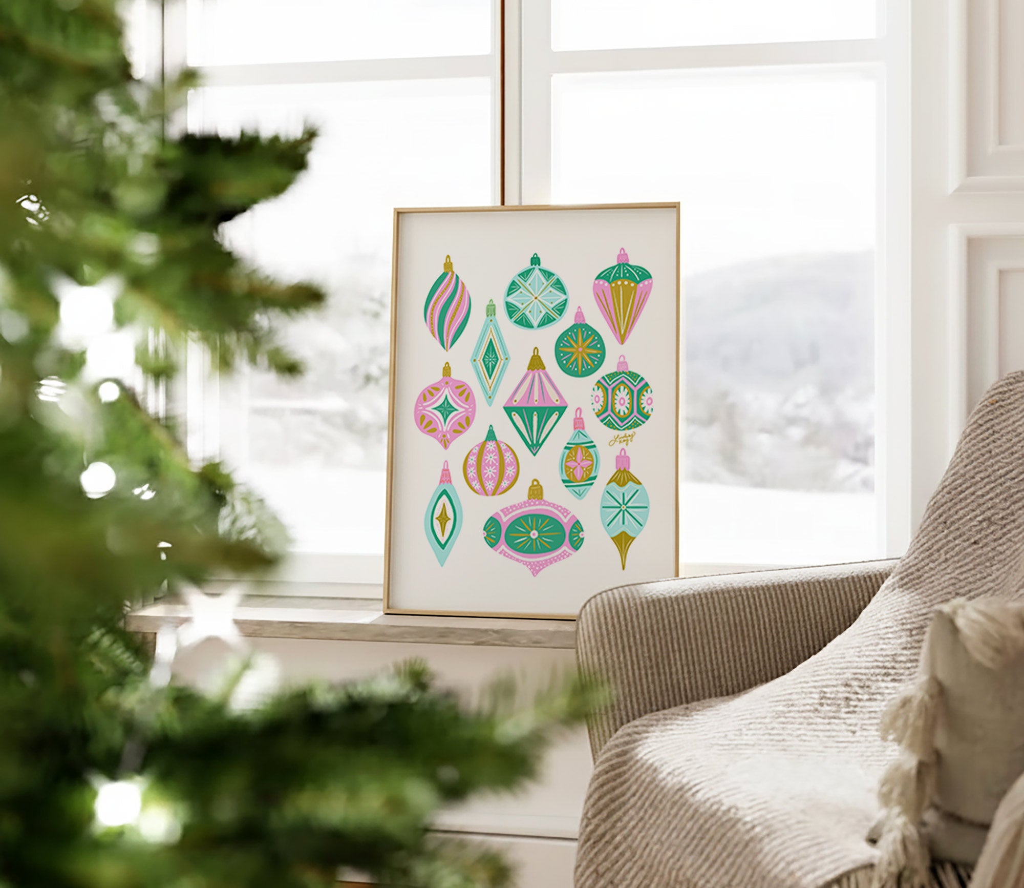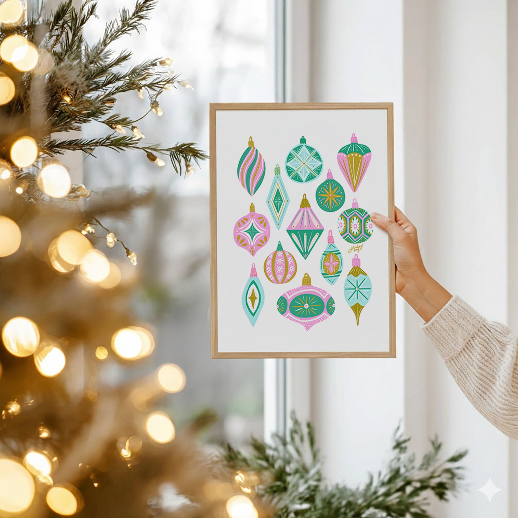 Hand-drawn retro Christmas ornaments art print by Lindsey Kay Collective – vintage holiday wall art for Christmas decor or gallery walls – mid-century inspired festive artwork printed on enhanced matte paper with vibrant inks – available in 5x7, 8x10, 11x14, 11x17, 12x12, 12x18, 13x19, 16x20, 18x24, and 24x36 sizes